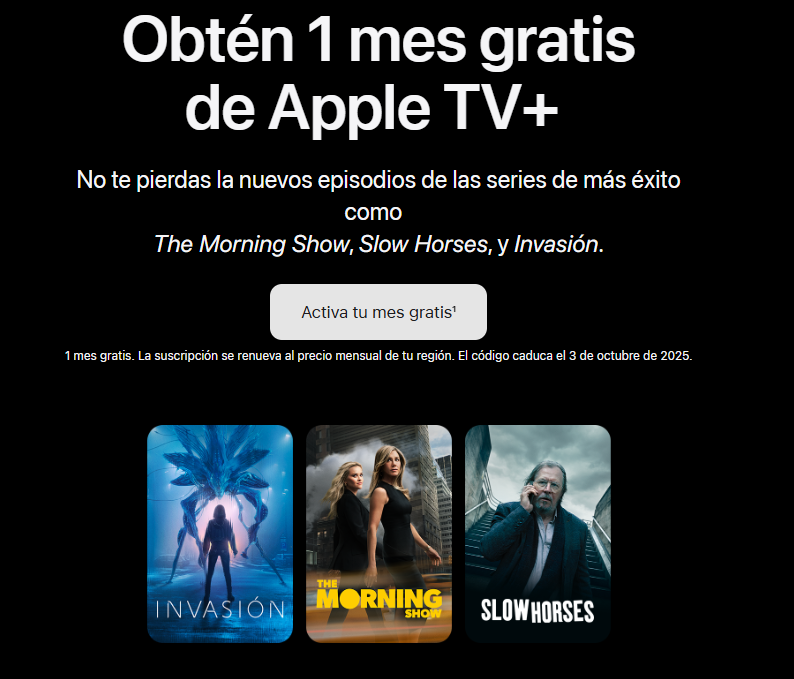 Disfruta de 1 mes gratis de Apple TV+ y accede a tus series Apple Original favoritas. Oferta válida hasta el 3 de octubre de 2025 para suscripciones reactivadas o nuevas que cumplan requisitos. Requiere cuenta Apple con método de pago. Renovación automática al precio mensual de tu región tras finalizar la promoción.