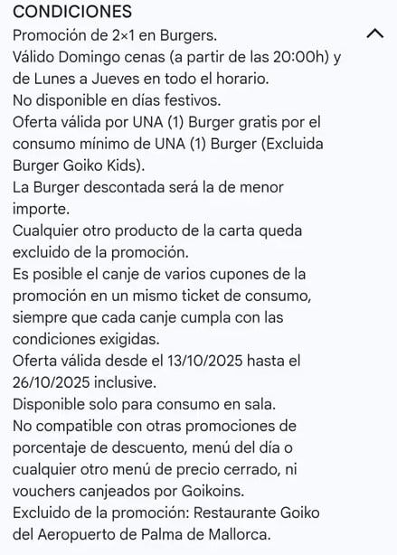 Excluido de la promoción: Restaurante Goiko del Aeropuerto de Palma de Mallorca.