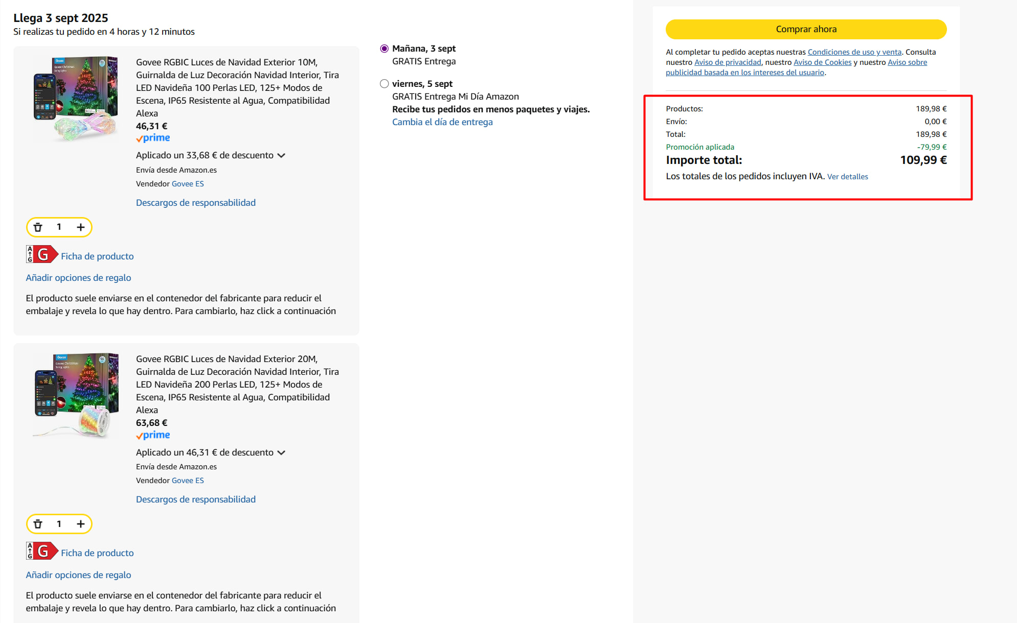 Muy buen precio para este pack de luces de navidad aptas tanto para interior como en exterior. Longitud de 20 metros para poder decorar el árbol de navidad, balcón o cualquier lugar de casa con sus más de 99 modos de escenas. Las podemos controlar mediante el móvil, con Google Home o Alexa. La promoción solo es aplicable si además añades la otra tira de luces LED de 10 metros, que te dejamos abajo los enlace: Enviado por Amazon.