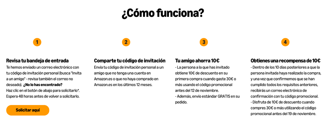 - El cliente debe invitar a un amigo que nunca haya comprado en Amazon.es, o que lleve más de 12 meses sin comprar en la plataforma.