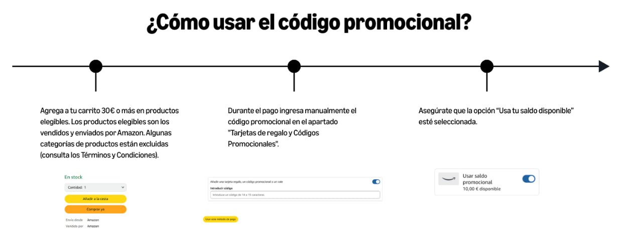 - El descuento solo se aplica en una compra mínima de 30 € en productos vendidos y enviados por Amazon.es, excluyendo ciertas categorías como dispositivos Amazon, libros, contenido digital, tarjetas regalo, entre otros.