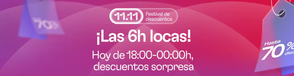 Día especial de ofertas en Miravia, ¡Las 6 horas locas! del "11.11", con 6 horas de descuentos sorpresa con hasta el -70% en una selección de productos TOP de primeras marcas. Desde tecnología hasta moda, aprovecha estas 6 horas de descuentos exclusivos y ahorra en tus compras favoritas.