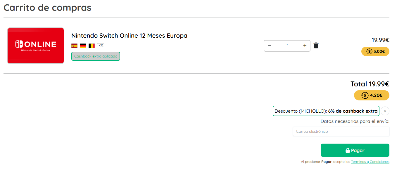 Cupón exclusivo que podremos aplicar sobre esta tarjeta para jugar Online durante 12 meses a nuestra consola Nintendo Switch por ejemplo, válida para toda Europa excepto Rumania. Además al realizar esta compra también dispondremos de un cashback de 4,2€ creándonos una cuenta en ZEN que podremos gastar en cualquier tienda online o física. Esta tarjeta nos costaría en Amazon 19,99€. El envío se realiza de forma instantánea a nuestro correo electrónico.