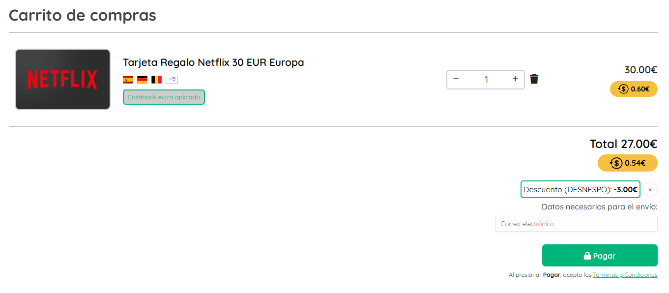 Nuevo cupón de 3€ de descuento directo en las tarjetas regalo de 30€ que podremos aplicar directamente sobre la tarjeta regalo de Netflix con la que acumularemos un cashback de 0.54€ .Solo válido para un uso por cuenta. Ideal para regalar y la tarjeta llega a nuestro correo de manera instantánea. El cashback de nuestra cuenta ZEN lo podremos gastar en cualquier establecimiento físico u online.