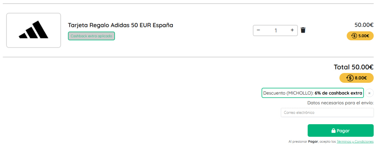 Cupón descuento que podemos aplicar sobre la tarjeta regalo con un saldo de 50€ en Adidas. Al aplicar el cupón obtendremos un descuento extra de 3€ con lo que acumularesmos un total de 8€ de cashback creándonos o usando una cuenta en ZEN, que podremos gastar en cualquier tienda online o física. Ideal tanto para realizar nuestras compras más baratas como para regalar.