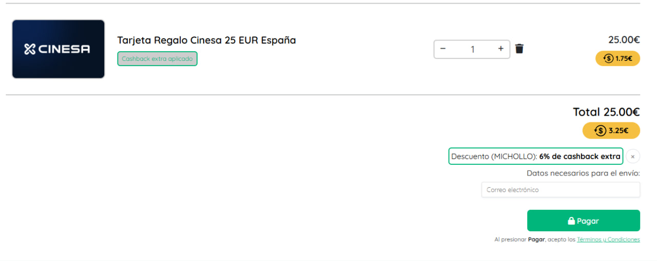 Cupón descuento que podemos aplicar sobre la tarjeta regalo con un saldo de 25€ en Cinesa. Al aplicar el cupón obtendremos un descuento extra del 6% con lo que acumularemos un total de 3.25€ de cashback creándonos o usando una cuenta en ZEN, que podremos gastar en cualquier tienda online o física. Ideal para ir al Cine más barato.