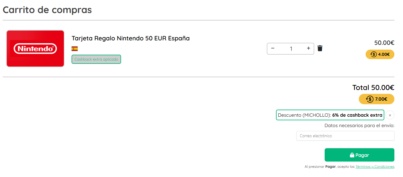 Cupón exclusivo con el que podremos acumular un mayor cashback sobre la tarjeta regalo con un saldo de 50€ para usarla en la eShop de Nintendo. Al realizar la compra dispondremos de un cashback de 7€ en nuestra cuenta en ZEN que podremos gastar en cualquier tienda online o física. Esta tarjeta nos costaría en Amazon 50€. El envío se realiza de forma instantánea a nuestro correo electrónico.