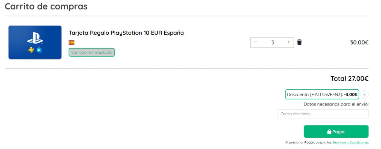 Añadiendo 3 tarjetas de 10€ a tu carrito y aplicando el cupón HALLOWEEN3 tan solo pagaras 27€.