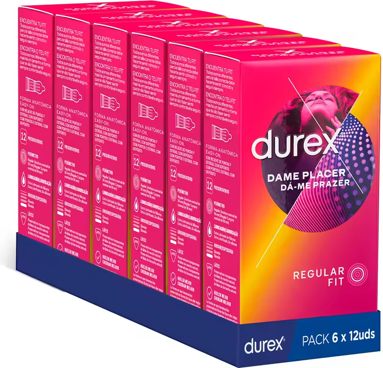 Cupón descuento para este pack que incluye 72 preservativos Durex dame placer con ajuste regular fit. Lubricados, transparentes, con una forma Easy On y realizados en de látex de caucho natural. En otras tiendas cada caja cuesta 7,99€. Envío GRATIS.