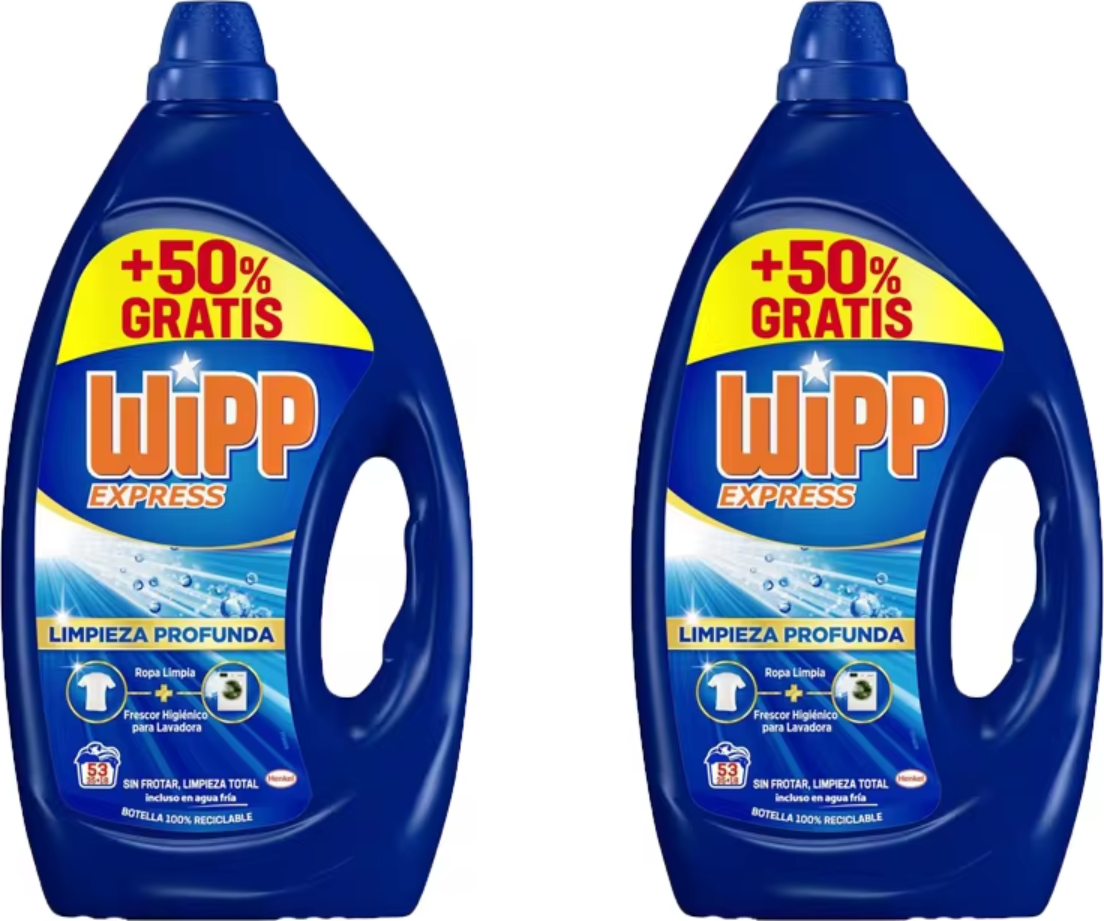 Muy buen precio para este pack de dos botes de Wipp Express detergente líquido higiene y antiolores para lavadora con un total de 106 lavados. Limpieza profunda, poder quitamanchas, luminosidad radiante, perfume duradero y protección de fibras en cada lavado. Envío gratis desde España.
