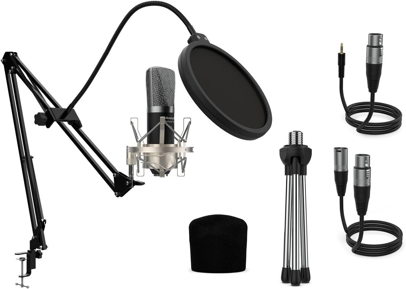 Precio chollo para este pack Audibax Berlin 1800 Silver Pro que incluye micrófono de condensador, soporte ajustable, filtro antipop y cables. Ofrece captación de sonido clara y precisa, ideal para grabaciones vocales o instrumentales. Construcción metálica resistente con acabado plateado profesional. Compatible con interfaces y mezcladores de estudio doméstico o profesional. Vendido y enviado por Amazon.