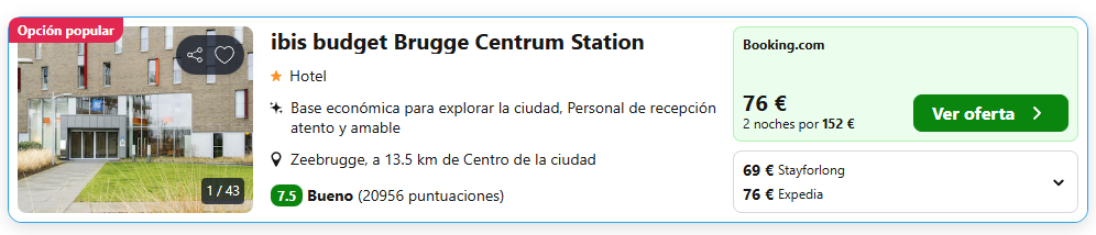 En esta escapada te hospedarás en el ibis Budget Brugge Centrum Station , un hotel práctico y bien valorado, con 4/5 estrellas en Tripadvisor . Su ubicación es ideal: junto a la estación de tren y a pocos minutos a pie de los principales puntos turísticos. Además, dispone de recepción 24 h para tu comodidad.