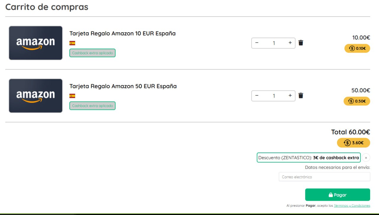 Nuevo cupón descuento que podemos aplicar sobre la tarjeta regalo con un saldo de 60€ en Amazon.. Al realizar la compra, dispondremos de un cashback de 3€ creándonos una cuenta en ZEN que podremos gastar en cualquier tienda online o física. Solo se puede aplicar 1 vez el cupón por cuenta.
