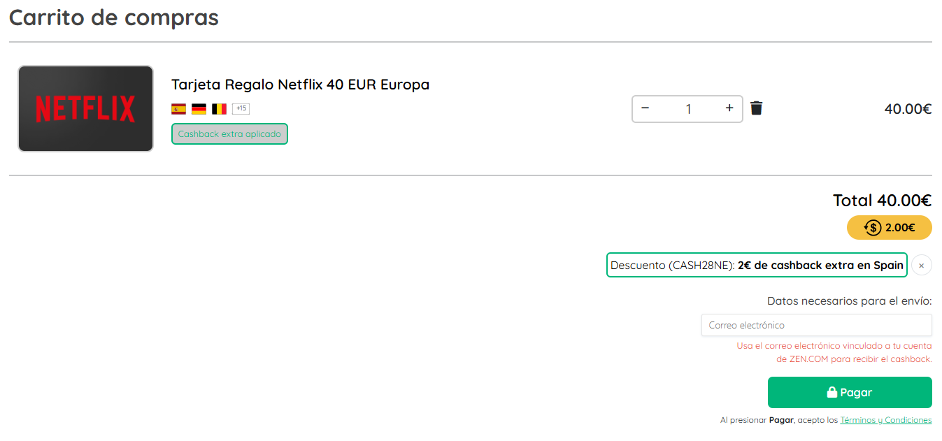 Nuevo cupón para Giftsy en el que podrás conseguir una tarjeta regalo de Netflix a mejor precio, con lo que conseguirás una tarjeta de 40€ pagando tan solo 38€ acumulando 2€ de cashback en tu tarjeta ZEN. Una tarjeta regalo que es perfecta ahora en que se termina el verano, y las nuevas series, películas, docus y temporadas que se avecinan.