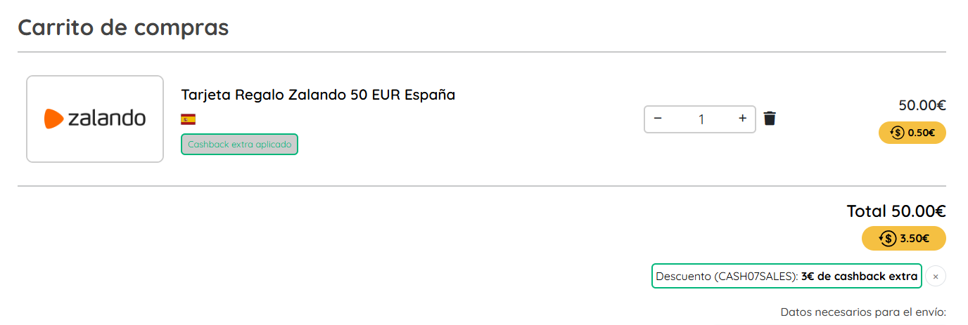Cupón exclusivo que se aplica directamente sobre la tarjeta regalo de 50€ para comprar en Zalando . Solo se puede usar 1 vez el codigo descuento por cada cuenta. Ideal para regalar y la tarjeta llega a nuestro correo de manera instantánea. Además dispondremos de un cashback en nuestra cuenta en ZEN que podremos gastar en cualquier establecimiento fisico u online.