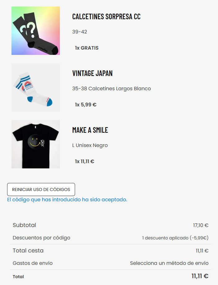 Nueva promoción disponible en Pampling. TODAS las camisetas de la web Pampling, si, puedes elegir la que quieras y en la talla que desees. Fabricadas en 100% algodón e impresas mediante serigrafía, además también, dos pares de calcetines GRATIS (Un par de calcetines a elegir y otro sorpresa) entre todos los que hay (2,5€ de gastos de envío en pedidos inferiores a 50€ o gratis si eliges recogida en tienda). Tan solo tienes que aplicar el cupón MICHOLLO21.