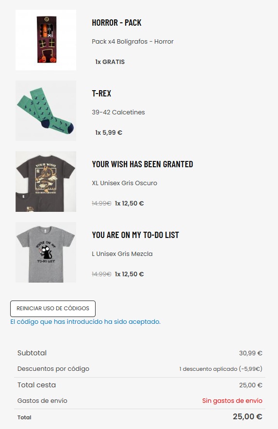 Nueva promoción disponible en Pampling. TODAS las camisetas de la web Pampling (comprando 2 o más), si, puedes elegir la que quieras y en la talla que desees. Fabricadas en 100% algodón e impresas mediante serigrafía, además también, un par de calcetines GRATIS a elegir entre todos los que hay (2,5€ de gastos de envío o gratis si eliges recogida en tienda). Tan solo tienes que aplicar el cupón MICHOLLO21.