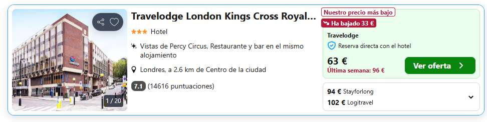 La propuesta es el Travelodge London Kings Cross Royal Scot, un hotel bien valorado con 4,1/5 en Tripadvisor y situado a pocos minutos de la estación de Kings Cross.