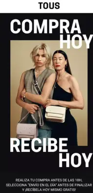 237 GRATIS JOEL_C99Hace 3 años Día de la Madre: Compra hoy y recibe hoy en Tous GRATIS Este día de la madre celebra a lo grande con Envío GRATIS en tus compras y además si seleccionas envío hoy recibes el pedido hoy m ... Leer mas