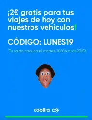 317 dimocaHace 5 años 2€ en Cooltra Motosharing 2€ gratis para tus viajes de hoy con sus vehículos aplicando el cupón LUNES19 en la app Cooltra. LUNES19